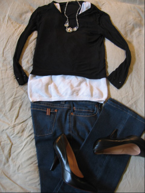 メッシュの下着とシースルー長袖Tシャツ×ストレートフィットジーンズ。